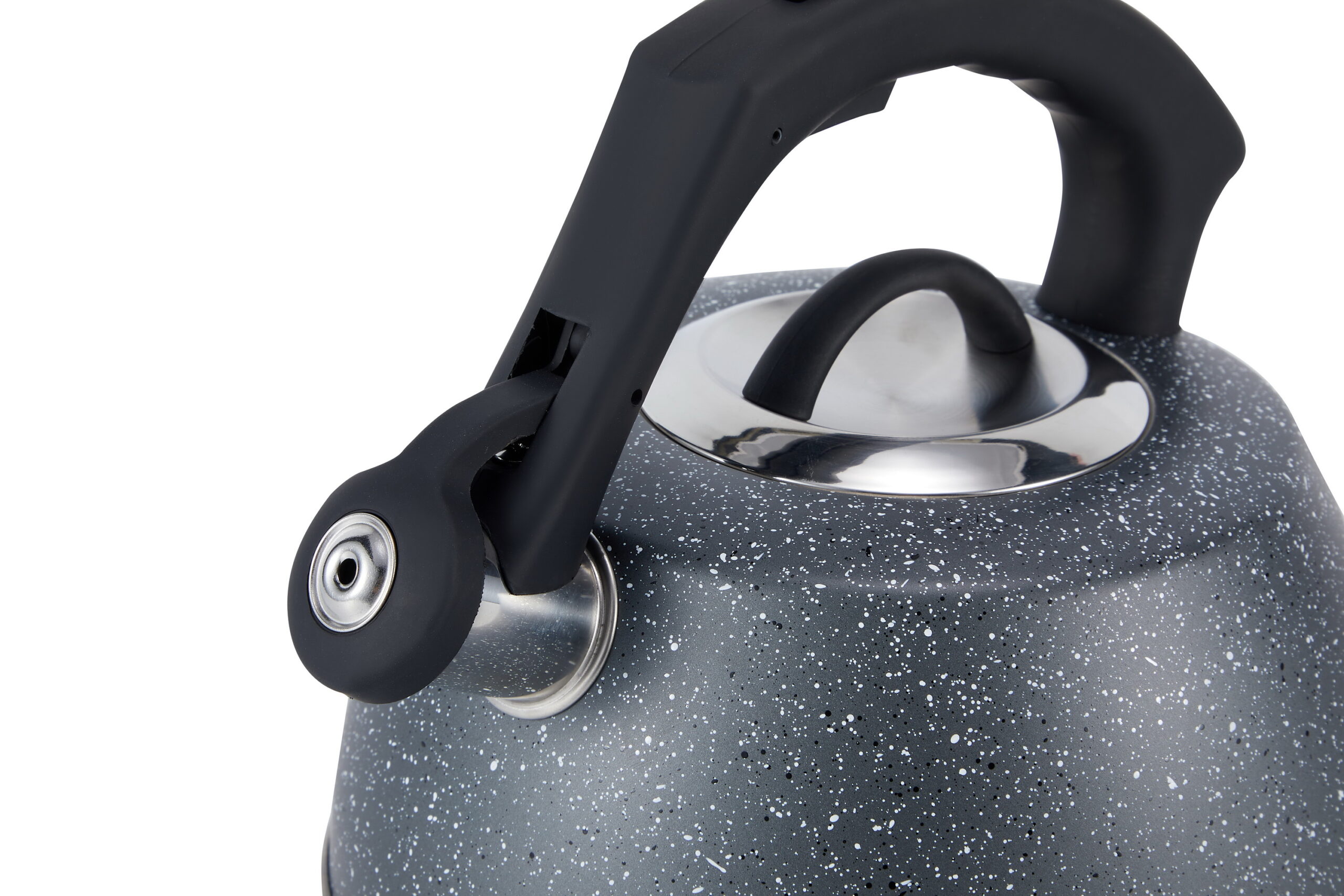 Чайник зі свистком. Виготовлений з високоякісної нержавіючої сталі 18/10 (АISI 304), термостійке зовнішнє покриття, капсульоване дно для рівномірногооптимального нагрівання. Міцна термостійка нейлонова ручка з Soft Touch покриттям. Гучний нейлоновий свисток зі сталевою серцевиною та пристроєм для відкриття носика на ручці.