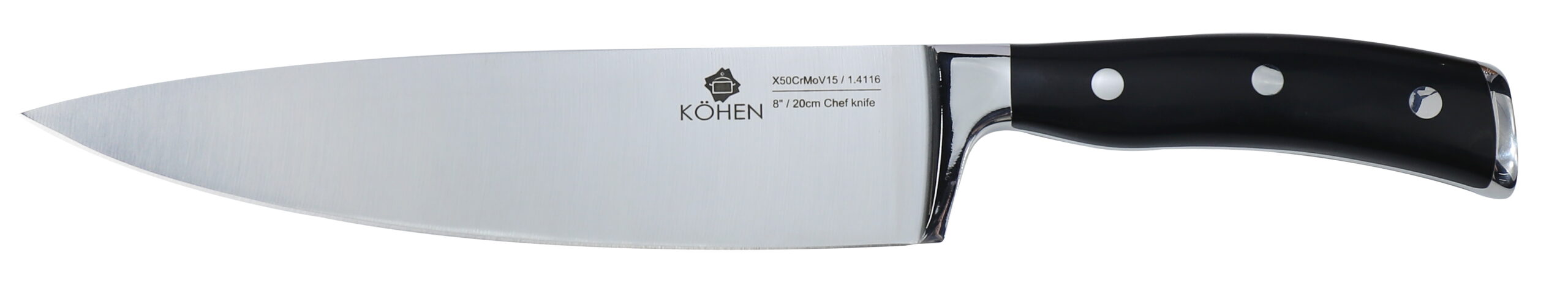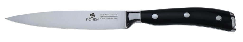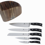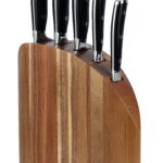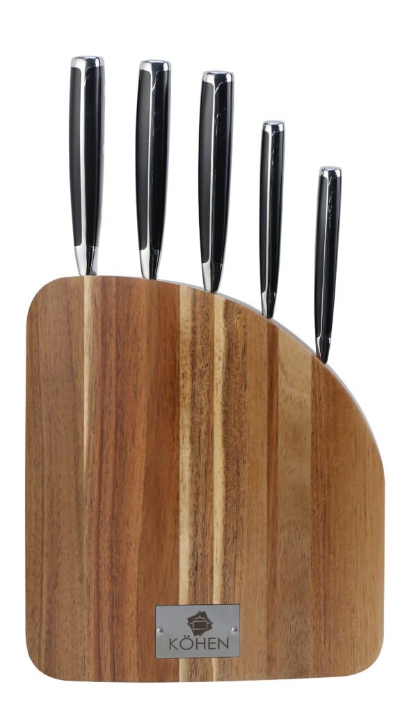 Набір ножів (5 ножів + блок). Лезо виготовлене з хром-молібден-ванадієвої сталі марки 5CR15MOV (1.4116) з технологією низькотемпературного загартування. Гарантована стійкість до деформації та корозії протягом тривалого часу.